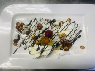 Serveras med bakad banan, vaniljglass, vaniljgrädde, salt och honungsrostade hasselnötter, krossad maräng, chokladsås