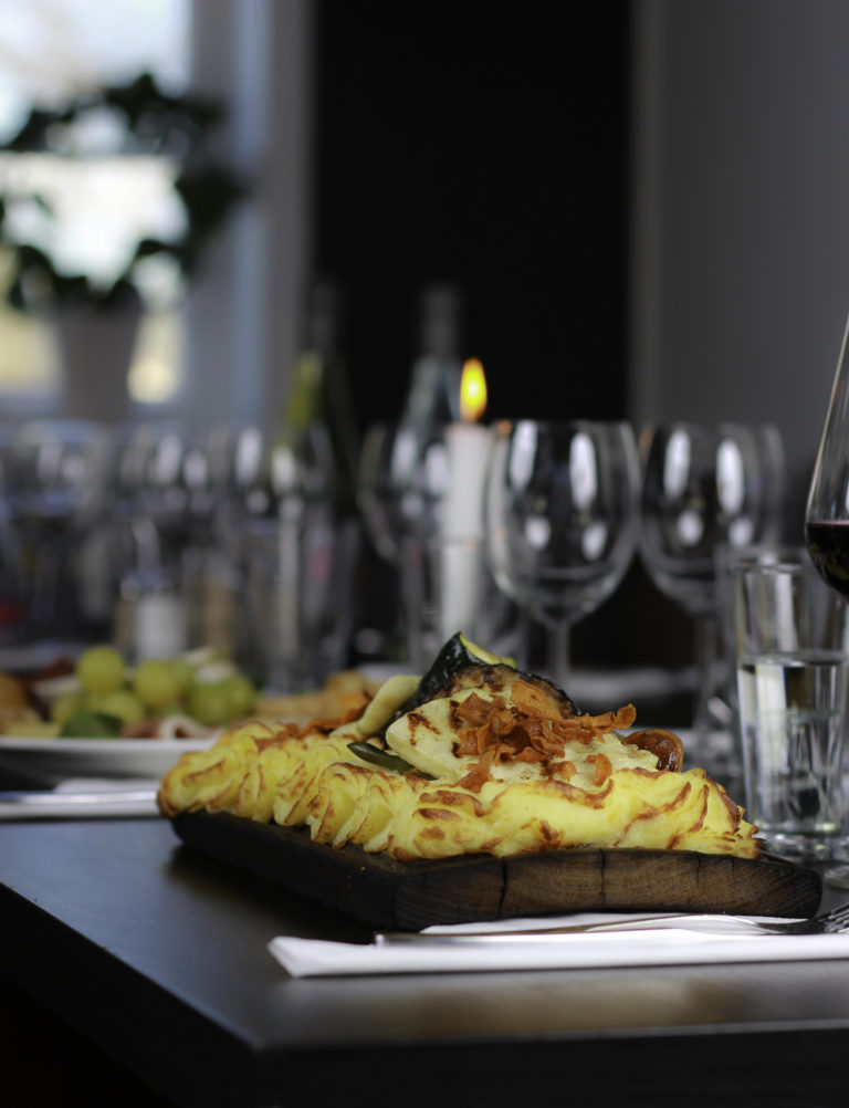 Med rödvinssås, bearnaisesås och pommes duchesse