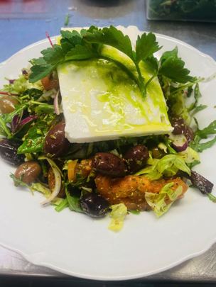 Serveras med krispig sallad slungad med grekiska kryddor, fetaost, olivolja, tomat, oliver, rödlök samt grillat surdegsbröd.