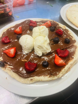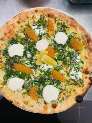 Hemgjord tomatsås, skivad mozarella, toppad med färsk tomatsallad, basilika, burrata, ruccola och pinjenötter